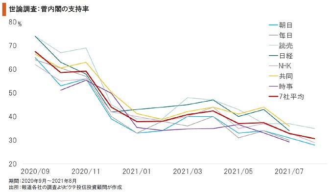 東京五輪への評価が高まる一方、菅内閣の支持率は低下を続けている。8月は朝日新聞、NHKの調査で30%を割り込んだ。五輪はIOCと開催都市である東京都、そしてJOCの契約により開催され、政府の役割は側面支援である。従って有権者は五輪の成果と政権への評価を切り離し、ワクチン接種の遅れを含めた新型コロナの感染拡大に注目しているのだろう。