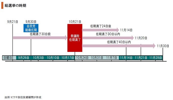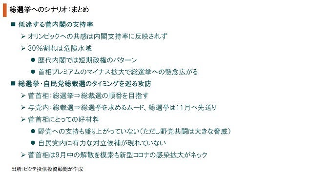 公職選挙法の規定により、衆議院選挙の投票日は実質的に9月26日~10月17日、もしくは11月14日~28日、この間の7回の日曜日に限られる。自公両党内では、ワクチン接種の進捗に鑑み、「総選挙11月論」が勢いを得ている模様だ。一方、菅首相は、総選挙で自民党の議席減を30程度に抑え、その後の総裁選で無投票再選を目指すのがメインシナリオだろう。