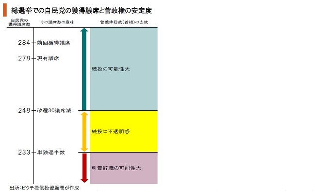 自民党総裁選に先立ち総選挙が行われた場合。菅首相続投の条件は自民党の議席減を30程度に食い止めることだろう。一方、同党の獲得議席が単独過半数を割った場合、総裁選への立候補も困難になると考えられる。従って、単独過半数である233議席から30議席減の248議席のゾーンは、菅首相にとって続投の可否が不透明なゾーンと言えるのではないか。