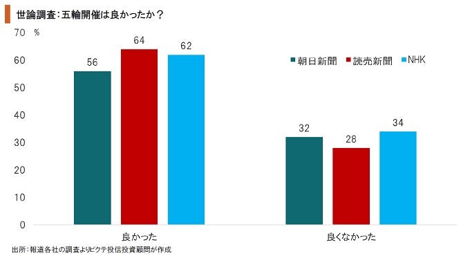 朝日新聞が7月18、19日に行った世論調査では、今夏のオリンピック・パラリンピック開催について、55%が「反対」と回答、「賛成」の33%を大きく上回った。しかしながら、五輪閉会式前後の報道各社の調査によると、五輪開催を「良かった」とする回答者が軒並み5割を超えている。アスリートの熱戦、特に日本人選手の活躍により、五輪のイメージは大きく変化したようだ。