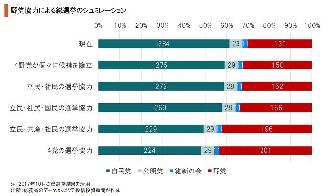 総選挙に大きな影響を与えるのが野党の姿勢だ。各党の支持率を足しても自民党1党に及ばないが、小選挙区で立憲民主、共産両党が完全に候補者調整した場合、2017年10月の選挙結果を使ったシミュレーションでは、自民党が単独過半数を割る可能性が台頭する。菅首相としては、野党の調整を阻止する意味でも、早期解散を目指すのではないか。