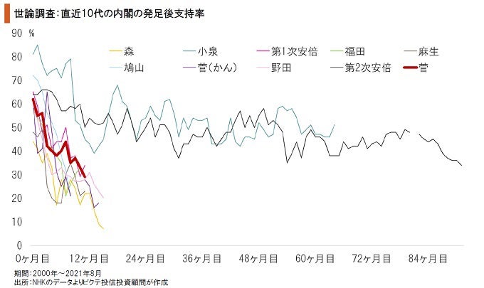 過去10代の政権を見ると、NHKの世論調査で内閣支持率が30%を割ると、そこから1年以内に例外なく退陣に追い込まれた。菅首相の場合、総選挙、そして自民党総裁選が迫るなかで、支持率は発足以来の最低水準になっている。五輪の開催を支持回復に結び付けられなかったことで、新型コロナ禍に対して結果を出す以外、挽回のチャンスは見出し難い。
