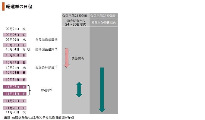 衆議院の任期満了は10月21日だ。しかし、自民党総裁選後に首班指名のための臨時国会が開かれ、新首相の所信表明演説、新内閣に対する与野党の質疑が行われる見込みで、公職選挙法の規定により任期中の総選挙は実質的に不可能になった。最大で11月28日までの先送りが可能ではあるが、総選挙の投票日は11月14日を軸に検討されるだろう。