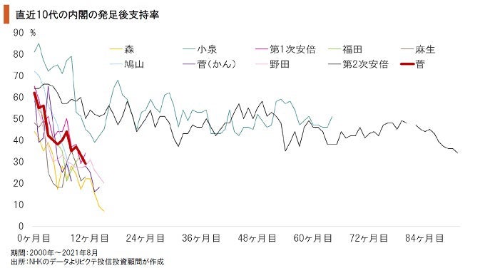 9月3日、菅首相は即席の会見で自民党総裁選への不出馬を発表した。新型コロナ禍へ対応力を欠き、内閣支持率が低迷するなか、人事、衆議院解散による局面転換を図ったが、自民党内の抵抗に遭って頓挫、その時点で再選戦略は実質的に潰えたのだろう。政権発足直後からの内閣支持率急低下は、過去の短命政権と同様の経過をたどったと言えそうだ。