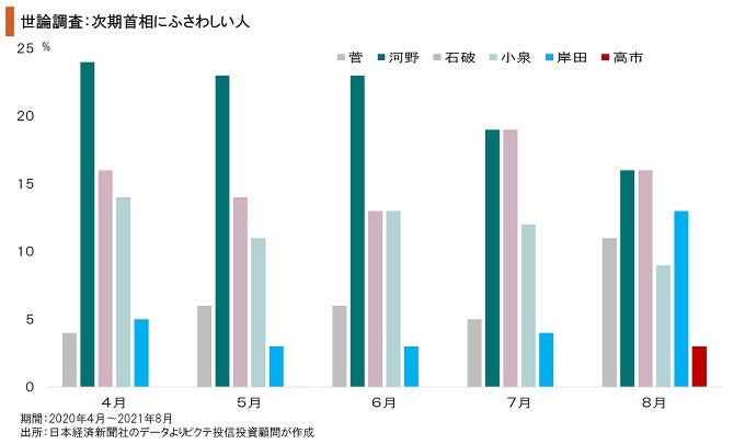 報道各社の世論調査では、「次の自民党総裁(首相)にふさわしい人」との設問に対し、従来、河野大臣、石破元幹事長、小泉環境相を挙げる回答者が多かった。しかし、日本経済新聞社が8月27~29日に行った調査では、岸田氏が13%を得て16%の石破氏、河野氏に肉薄している。菅首相へ対決姿勢を示したことが、今のところ奏功したと言えるのではないか。