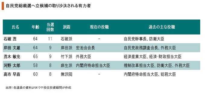 3人以上の有力候補が立つ場合、票が分散化され決選投票になるだろう。その場合、党員投票は行われないため、国会議員の動向を左右する派閥の影響力が強まる。最大派閥を実質的に率いる安倍前首相が河野大臣、石破氏を支持することは考え難い。高市氏が決選投票に進めず、岸田氏が勝ち残れば、同前首相は岸田氏を推す意向なのではないか。