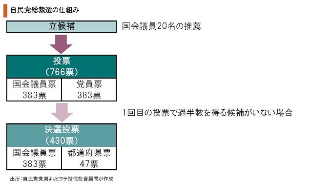 自民党総裁選は、同党所属議員に1人に1票、党員に国会議員と同数の票が与えられる。現在、同党所属の国会議員は385人だが、選管委員長・副委員長は投票しないため、投票総数国会議員、党員合計で766票に他ならない。1回目の投票で過半数を得る候補がいない場合、1、2位による決選投票が行われる。この時も国会議員は1人に1票だが、党員投票はなく、47都道府県の自民党県連が各1票を投じる仕組みだ。つまり430票を争うことになる。
