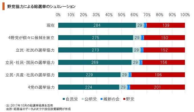 2017年10月の総選挙結果を基にシミュレーションすると、立憲民主党、共産党など野党4党が小選挙区で選挙協力した場合、自民党の獲得議席は220台となる可能性がある。ただし、公明党が20~30議席を確保すると見られ、連立与党では衆議院の過半数(233議席)を確保するのではないか。つまり、今回の総選挙による政権交代の確率は高くないだろう。