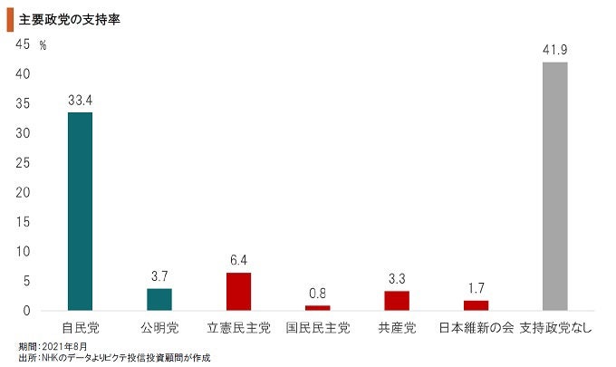 首相交代でも自民党は総選挙により議席を減らす可能性が強い。ただし、報道各社の世論調査を見る限り、野党への国民の期待が高まっているわけではないようだ。2009年8月の総選挙で政権交代した際には、同年春には旧民主党の支持率が自民党を上回っていた。足下、立憲民主党の支持率はNHKの調査で6.4%、30%台を維持する自民党との差は依然大きい。