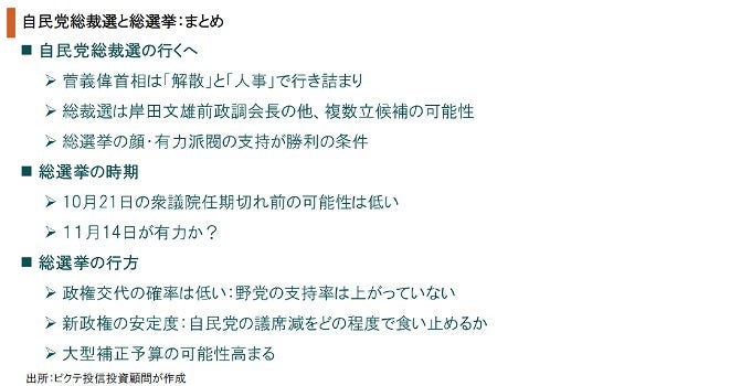 自民党総裁選挙は、岸田氏、河野氏、高市氏に加え、石破氏が立候補する可能性がある。ただし、菅首相、二階幹事長の仲介による河野氏と石破氏の連携が浮上するかもしれない。一方、岸田氏は、決選投票へ勝ち残り、その段階において安倍前首相、麻生副総理からの支持獲得を目指す戦略だろう。まだ不透明な要素もあるが、今週後半には立候補者が確定する見込みだ。その後の総選挙は11月中旬がメドになる。自民党の議席が減るとの見方が多いなかで、どの程度の歩留まりになるかは新内閣の安定度に大きく影響するだろう。ただし、野党への有権者の期待は高まっておらず、この選挙で政権交代が実現する可能性は低い。