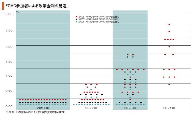 9月21、22日のFOMCで示された参加メンバーによる政策金利の予測では、2022年に最初の利上げが行われるとの見方が増えていた。ただし、2024年まで含めても利上げのペースは緩やかであり、それは新型コロナ禍の一時的要因が解消され、物価が安定することを前提としているだろう。今のところ、FOMCメンバーはインフレ圧力の高まりを懸念していない模様だ。