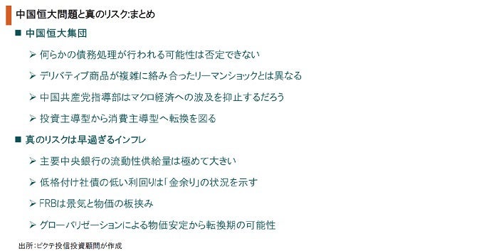 中国恒大集団の経営不安が世界のマーケットにおける不透明要因になっている。同社の負債総額は3,073億ドルに達し、デフォルトになれば中国経済への打撃になるだろう。ただし、リーマンショックと同列視するのは合理的ではない。当時の最大の問題は住宅抵当証券によるデリバティブ商品が入り組み、損失の確定が難しかったことだ。恒大の債務にはそこまでの複雑さはないだろう。また、「共同富裕」を目指す習近平政権にとって、一企業の消長とマクロ経済への影響は全く別物なのではないか。中国の指導層は、投資主導型から消費主導型へ経済構造の転換を図ることが予想される。そうしたなか、不動産開発大手の恒大集団の苦境は、中国経済の変化を象徴する事象と言えそうだ。一方、世界経済にとってより懸念されるのは、インフレの加速である。リーマンショック、新型コロナ禍の下で供給された大量のマネタリーベースは、物価押し上げ圧力の温床となり得るものだ。また、米中対立によるグローバリゼーションの終焉により、世界のサプライチェーンが分断され、資源の争奪戦が起こる可能性は強い。中長期的なインフレのリスクに対し、抵抗力のあるポートフォリオを目指すべきではないか。