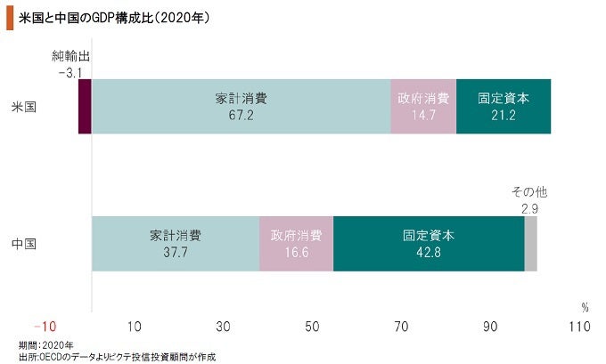 1980年代以降、中国は投資主導で経済を成長させてきた。その結果、2020年のGDPに占める固定資本投資の比率は43%に達している。一方、家計消費は38%に過ぎず、67%の米国を大きく下回った状態だ。中国の投資主導による経済成長は限界に来つつあり、不動産開発大手である恒大集団の苦境は、経済構造の転換を象徴する事象と言えるのではないか。