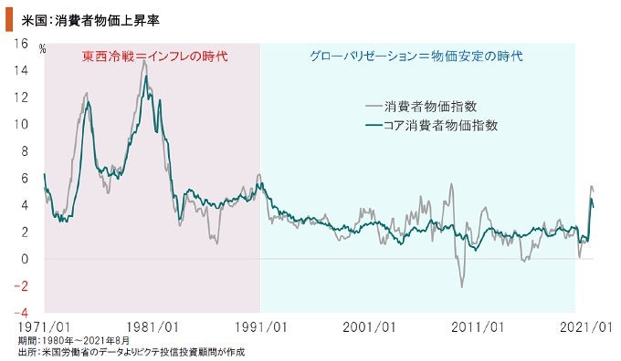 1991年12月の旧ソ連消滅により、世界はグローバリゼーションの時代へ突入した。中国や東アジア、メキシコなどが工業化、サプライチェーンの統合で、需要超過の米国も30年間に亘って物価安定の恩恵を享受したのである。しかしながら、米中対立が長期的に続くとすれば、サプライチェーンの分断や資源の争奪戦などによりインフレ圧力が強まる可能性は否定できない。