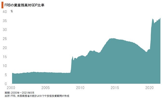 FRBの資産残高は、リーマンショック以前、名目GDPの6%で安定していた。金融危機後は25%を超え、さらに新型コロナ禍で37%まで拡大している。FRBがテーパリングを行ったとしても、供給したマネーを回収するわけではない。つまり、当面、米国の金融市場では平時に比べて金余りの状況が続くわけだ。これは、日銀、ECBも同様で、世界的に過剰流動性状態にある。