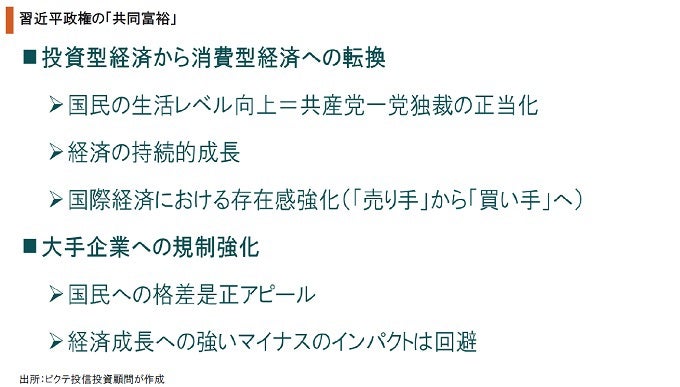 習近平政権の「共同富裕」は、一般国民の消費水準を引き上げることにより、共産党支配の正当性を確保、経済の持続的成長を目指していると見られる。また、世界中から資源、製品を調達することで、国際社会での発言力の強化を目指しているのではないか。そうしたなか、一部の大手企業に対する規制強化は、国民に「格差是正」を印象付ける意図があるのだろう。