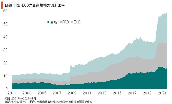 リーマンショック、新型コロナ禍への対応で、日銀、FRB、ECBは大規模なマネーの供給を行ってきた。その結果、リーマンショック以前にGDPの10%程度だった3中央銀行の資産規模は、足下、59.2%へと膨張している。経済規模に対する大量の供給は、中長期的に通貨価値を下落させる可能性が強い。特に日銀の資産規模対GDP比率は130.2%で突出している。