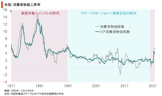 1991年の旧ソ連消滅により、世界はグローバリゼーションの時代に突入した。唯一の覇権国である米国の下、市場統合が進み、中国、東南アジア、中米諸国が工業生産力を強化したのである。その配当として、米国は物価安定を享受してきた。しかし、米中対立の時代に入り、国際的なサプライチェーンは分断されつつある。世界はインフレの時代を迎えたと言えよう。