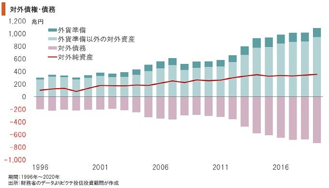 日本の対外純資産は世界最大の357兆円に達する。しかし、資産総額1,146兆円のうち、国の保有分は外貨準備の144兆円に過ぎない。残りは民間による投資であり、生産拠点を運営する海外子会社株式などが主だ。これは、政府が通貨価値を安定させる担保にはならないだろう。円急落の際、民間の対外資産を国が強制的に通貨防衛に使うことはできないからだ。