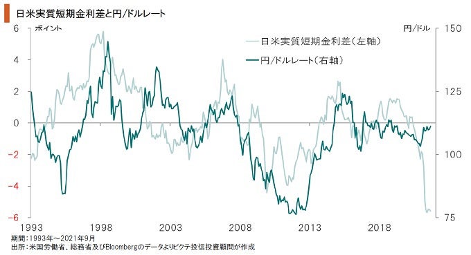足下、経済活動再開を背景に米国の物価が大きく上昇する一方、日本の物価は安定基調を維持している。その結果、日本の実質金利は米国を大幅に上回る状態だ。これは、過去のケースではドル安・円高の要因だった。しかし、今回は実質金利差が為替に影響していない。中長期的な円下落のリスクに対して、市場が懸念しつつあることを示すだろう。