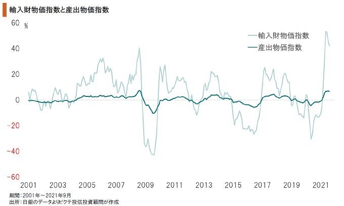 資源価格の上昇と円安の相乗効果で、輸入財物価指数は大幅な上昇局面を迎えている。産出物価指数も上昇してはいるが、輸入物価の上昇率には追い付いていない。つまり、日本経済の交易条件は悪化していると考えるべきだろう。これは、企業の利益を圧迫し、好ましからざる物価上昇を招く要因だ。円安は歓迎され易いが、むしろ現状は懸念材料なのではないか。