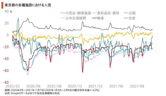 東京の繁華街における賑わいは、10月1日の緊急事態宣言解除後、飲食店の夜間営業が解禁されたこともあり急速に回復しつつある印象だ。もっとも、Googleの『コミュニティ・モビリティレポート』によれば、公共交通機関、職場の人流は、新型コロナ禍前(2020年1月3日〜2月6日の曜日別中央値)と比べ平均的に20%以上少ない状態が続いている。
