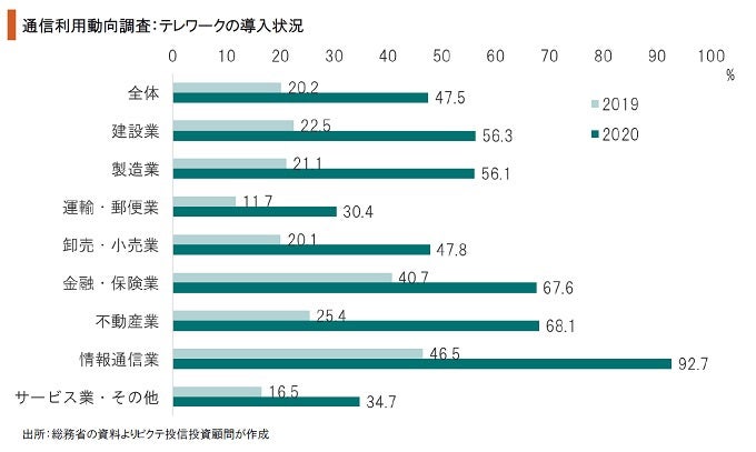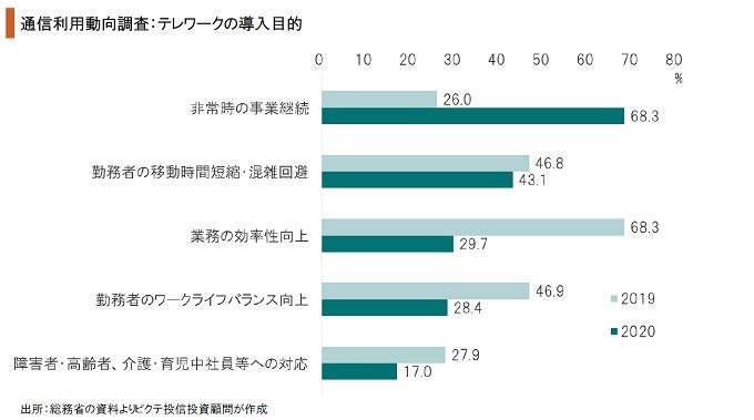 リモート技術、ブロードバンドのインフラは、新型コロナ禍以前に既に整備されていた。しかし、本格的な活用に踏み切るには重い経営判断が必要だ。通信利用動向調査のテレワークの導入目的に関する設問では、2019年時点で68.3%が業務効率の向上としていた。2020年は、非常時の業務継続が68.3%に達し、新型コロナがリモート化を後押ししたことが示されている。