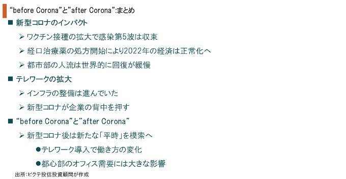 2022年は本格的な経済活動再開の年になるだろう。ただし、それは”before Corona”を「平時」としてそこに戻ることを意味するわけではない。新型コロナは「ゲーム・チェンジャー」であり、リモート化の社会的な浸透はその一側面と言える。”after Corona”は、”before Corona”とは不連続の世界と考えておくべきではないか。これは、企業経営、そして投資の上では非常に重要だ。例えば、都心部のオフィス需要が新型コロナ禍前のレベルに戻るには相当の時間を要すると推測される。ただし、リモート、サブスクの長期的な成長は市場に織り込まれた感も強い。当面、市場はニューノーマル下における新たな主役を探すフェーズに入るのではないか。