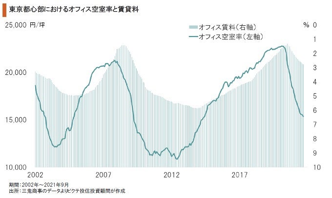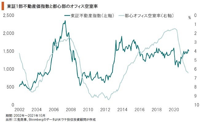 従来、東証1部不動産指数はオフィス空室率に概ね連動した。新型コロナの下で動きにずれが生じているのは、不動産事業がオフィスだけでなく、住居や商業施設、物流倉庫など多様な分野に広がったからではないか。もっとも、リアルとリモートのハイブリッド型が「ニューノーマル」とすれば、東京都心のオフィス市況が本格的に回復するにはかなりの時間を要するだろう。