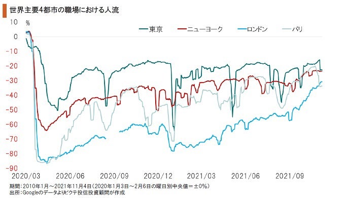 巨大都市の人出がコロナ禍以前の水準へ戻らないのは、東京及び日本に限られた現象ではない。主要先進国ではワクチン接種の進捗に伴い新型コロナの重症化が抑制され、政策の軸足は感染防止から経済に移りつつある。そうしたなか、人の流れを示すデータは、”before Corona”と”after Corona”の社会に不連続な部分があることを示唆しているのではないか。