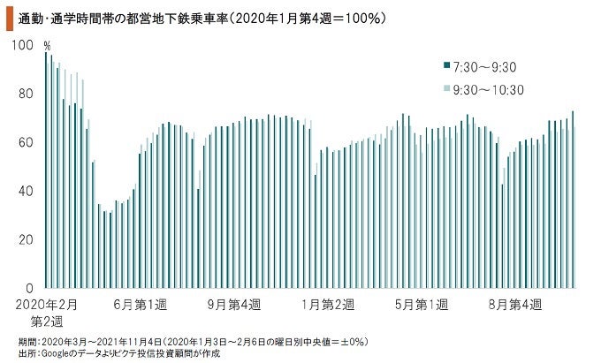 東京都営地下鉄の通勤・通学時間帯における乗車率は、11月第1週、新型コロナ前の乗車率を100%として72.8%だった。昨年4月第4週には31.6%まで落ち込み、その後はゴールデンウィーク、お盆など特殊な期間を除き60~70%の推移を続けている。足下、人の動きが活発化してきたように見えるものの、かつての平時を3割ほど下回る状況が続いている。