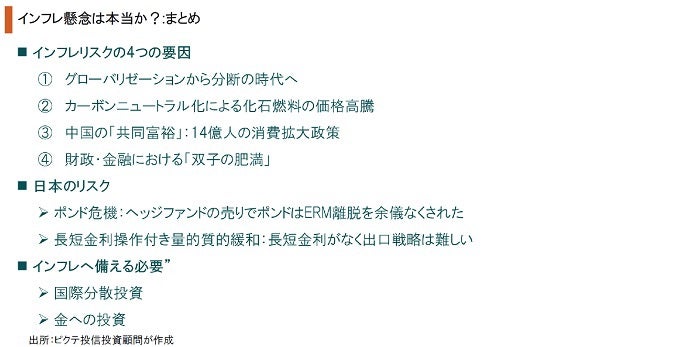 現状、インフレはリスクシナリオの1に過ぎない。ただし、国際情勢を俯瞰すると、1)世界的な分断、2)化石燃料の価格高止まり、3)中国の「共同富裕」政策、4)主要国政府・中央銀行の「財政・金融双子の肥満」により、世界経済が通貨価値下落(=インフレ)の時代に突入した可能性は高まっている。そうしたなか、日本は財政支出の拡大を続け、それを日銀の実質的な財政ファイナンスで支えてきたが、転機が訪れつつあるのではないか。特に日銀のイールドカーブコントロールは、出口戦略発動時に大量の国債売りを喚起することが想定される。金融資産の運用に当たっては、金の組み入れなど、インフレリスクに備えるべきだろう。