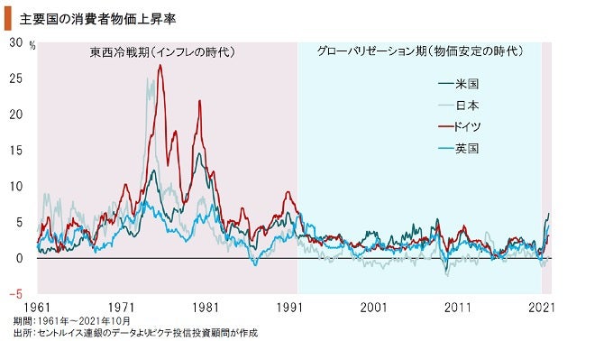 東西冷戦期は世界的なインフレの時代だった。しかし、1991年のソ連消滅によってグローバリゼーションの時代に突入、サプライチェーンと金融市場の国際的統合、中国など新興国の工業化により、先進国に物価安定がもたらされた。足下、米中の覇権争いは世界が再び「分断の時代」を迎えたことを示唆する。それは、経済面においてインフレを意味するのではないか。