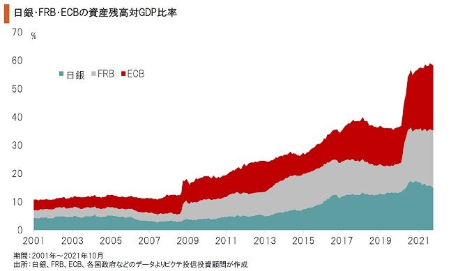 リーマンショック、新型コロナ禍の下で主要国は財政支出を急拡大した。それを支える意味もあり、日銀、FRB、ECBの資産規模は対GDP比で大幅に増加している。つまり、マネタリーベースが大量に供給されているわけだ。インフレ期待が強くなれば、このマネーは実物資産へ向かうだろう。通貨価値下落(=インフレ)を加速させるマグマと言えるのではないか。