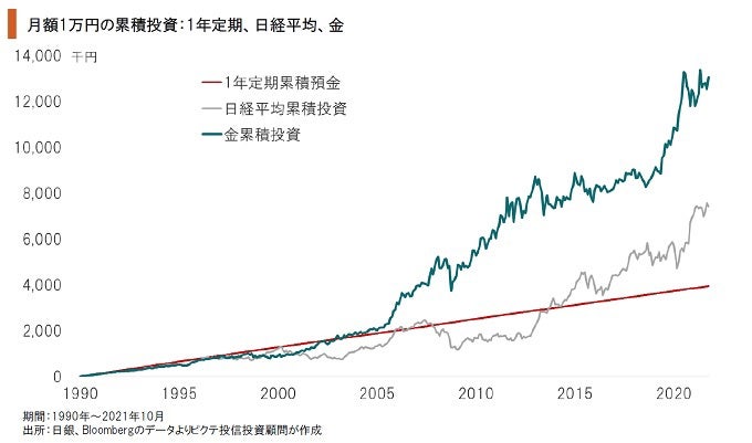 1971年8月の「ニクソンショック」により金はドルへの兌換が停止され、コモディティの1つになった。ただし、過去30年間の物価安定の時代においても、その価格は優れたパフォーマンスを示している。金は利息収入を生まないため、金融資産としての保有には限度があるだろう。ただし、一定程度の組み入れは、インフレリスクへのヘッジ手段として有効と考えられる。