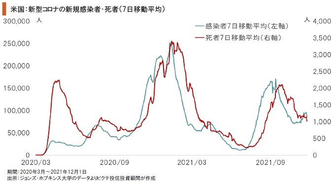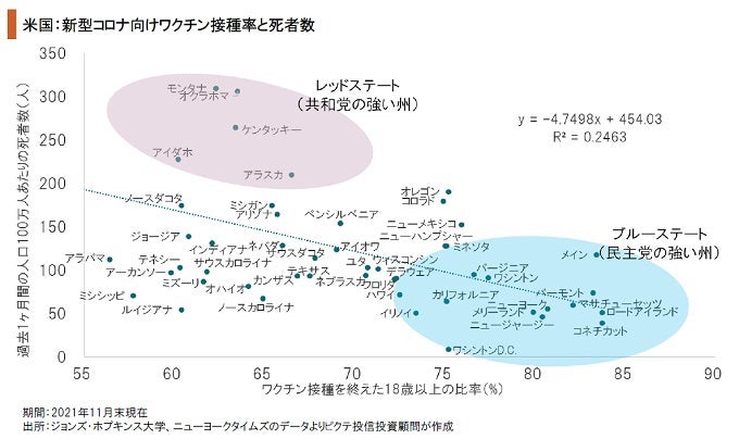 米国においてワクチン接種が進んでいるのはニューヨーク、マサチューセッツなど東北部だ。これらの州では人口100万人当たりの死者が低水準となり、ワクチンの重症化抑制効果が示されている。オミクロン型に対応したワクチンの開発・供給には数ヶ月を要する見込みだが、これまでの例から見れば、接種の進捗は経済活動を正常化する上で重要なステップと言えよう。