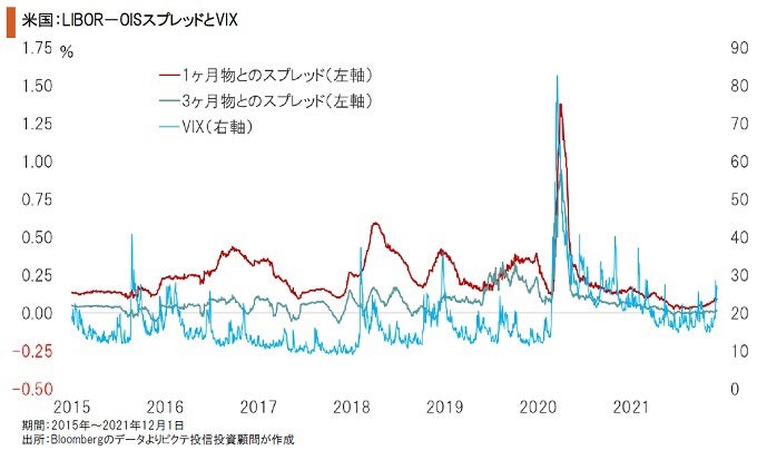 オミクロン型への変異が伝えられると、株式、原油などのロングポジションが解消を迫られ、これらの価格は急落した。一方、米国の金融市場全般を見渡すと、債券やクレジットについては昨年春と比べ落ち着いた動きとなっている。これは、過去1年の経験を通じて、新型コロナ禍が一時的に深刻化しても、経済活動は維持されるとの学習効果に拠るのではないか。