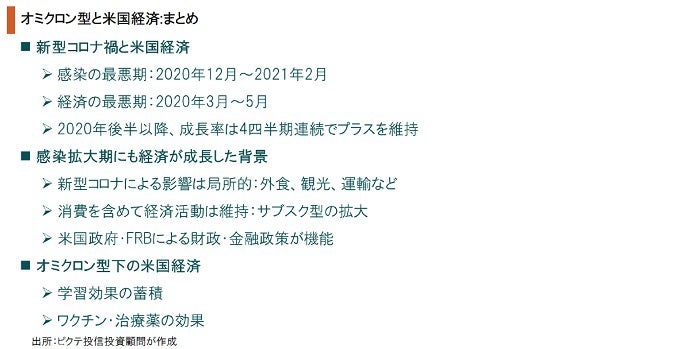 過去2年近くの対新型コロナの経験により、米国経済は感染拡大期も成長することが確認された。また、ワクチン及び治療薬の開発は、1年前と比べて新型コロナ対策が大きく進歩したことを示す。オミクロン型へ対応するため、開発期間に数ヶ月を要するとしても、経済活動を正常化させるプロセスの遅れとしては致命的ではない。こうした学習効果により、米国の金融市場は昨春に比べて落ち着いた動きになっているのではないか。オミクロン型の性質に関する科学的な解明はこれからだ。もっとも、これまで積み上げてきた学習効果により、市場が再びパニックに陥る可能性は高くない。中長期的にはインフレがより重要な市場変動要因だろう。