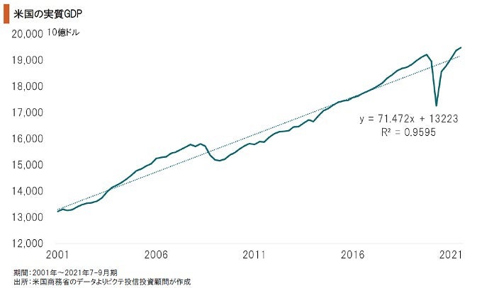 新型コロナ禍による最初のショックが米国経済に及んだ2020年4~6月期、実質経済成長率は年率換算で31.2%の落ち込みとなった。もっとも、その後はV字回復軌道をたどり、今年4~6月期には2000年代に入って以降の巡航速度である年率1.9%の成長軌道に戻っている。昨年後半はロックダウン下にあったものの、経済活動は着実に再開されていたわけだ。