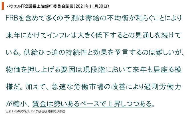 11月30日、上院銀行委員会で証言したFRBのジェローム・パウエル議長は、オミクロン型以上にインフレ圧力に対し警鐘を鳴らした。これは、「インフレは一過性」としてきた従来のFRBの見解を修正するものだ。特に同議長が強調したのは、労働需給のひっ迫による賃金の上昇圧力だった。賃金は消費者物価との連動性が強く、同議長の指摘は現実に即しているだろう。