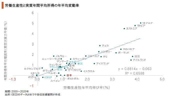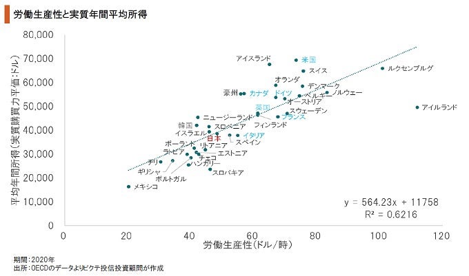 OECD加盟国の間で比較した場合、労働生産性と実質年間平均所得には正の相関が認められ、日本はほぼ一次回帰直線上だ。決定係数(R2)は0.62なので、この関係には「統計的に説明能力がある」と言って良いだろう。つまり、グローバリゼーションの下、先進国間では労働生産性の水準に従って、かなり合理的に相対的な所得水準が決まっていると考えられる。