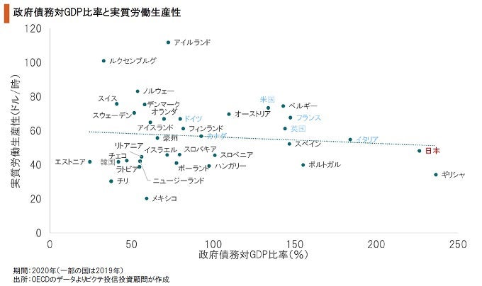 政府債務残高対GDP比率と実質労働生産性に統計上の有意な関係は認められなかった。ただし、政府債務残高の対GDP比率が150%を超えているポルトガル、イタリア、日本、ギリシャのなかで、実質労働生産性が60ドルを超えている国はない。経済が国家財政に依存し、公的債務残高が大きい国の場合、生産性は自ずと低水準にならざるを得ないのだろう。