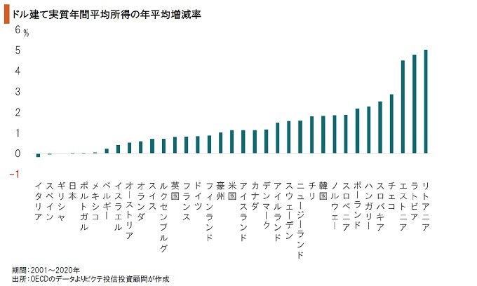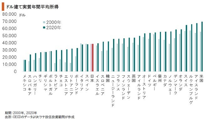 分配の見直しを掲げて政権を担う岸田首相の下、最近の政治の問題意識として共通しているのは、日本の賃金の相対的な低さではないか。OECDによれば、2020年における日本のドル建て実質年間所得額は3万8,515ドル、加盟35ヶ国中22番目だった。2000年は17位だったので、この20年間で順位を下げており、トップの米国との格差は1.8倍に達している。