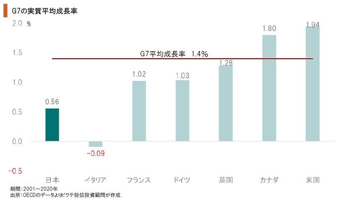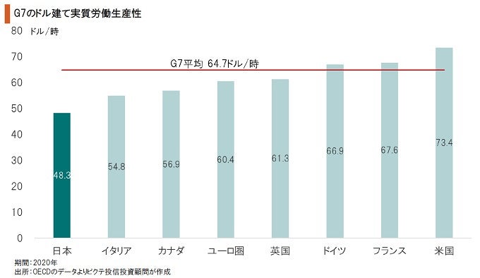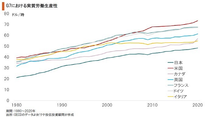 G7各国における労働生産性の推移を比べると、日本の水準は1980年代から相対的に低位に止まっていた。ただし、当時は労働力人口が増加しており、企業による国内での設備投資も活発だったため、高い経済成長率を維持できていたのだろう。2001年以降、日本の労働生産性は年率1.1%のペースで改善しているものの、他の6ヶ国に追い付くには至っていない。