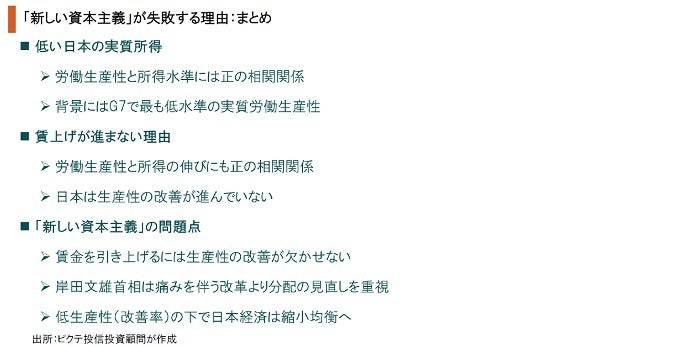 所得の再分配に重きを置いた経済政策が岸田政権の掲げる「新しい資本主義」とすれば、それは「新しい」わけではなく、基本的にリベラル色の強い「大きな政府」だ。日本に足りないのは技術革新を促し、生産性を向上させる制度設計の改革である。むしろ「小さな政府」を前提とした新自由主義政策を進めることが必要なのではないか。岸田首相がそのことを理解していないようだと、経済政策は失敗する可能性が低くない。特に世界的なインフレ圧力が日本経済にも影響しつつあるなか、財政政策と金融政策による目先の景気偏重の政策は、生産性の向上が阻害されるだけでなく、物価を一段と不安定化させるリスクがある。