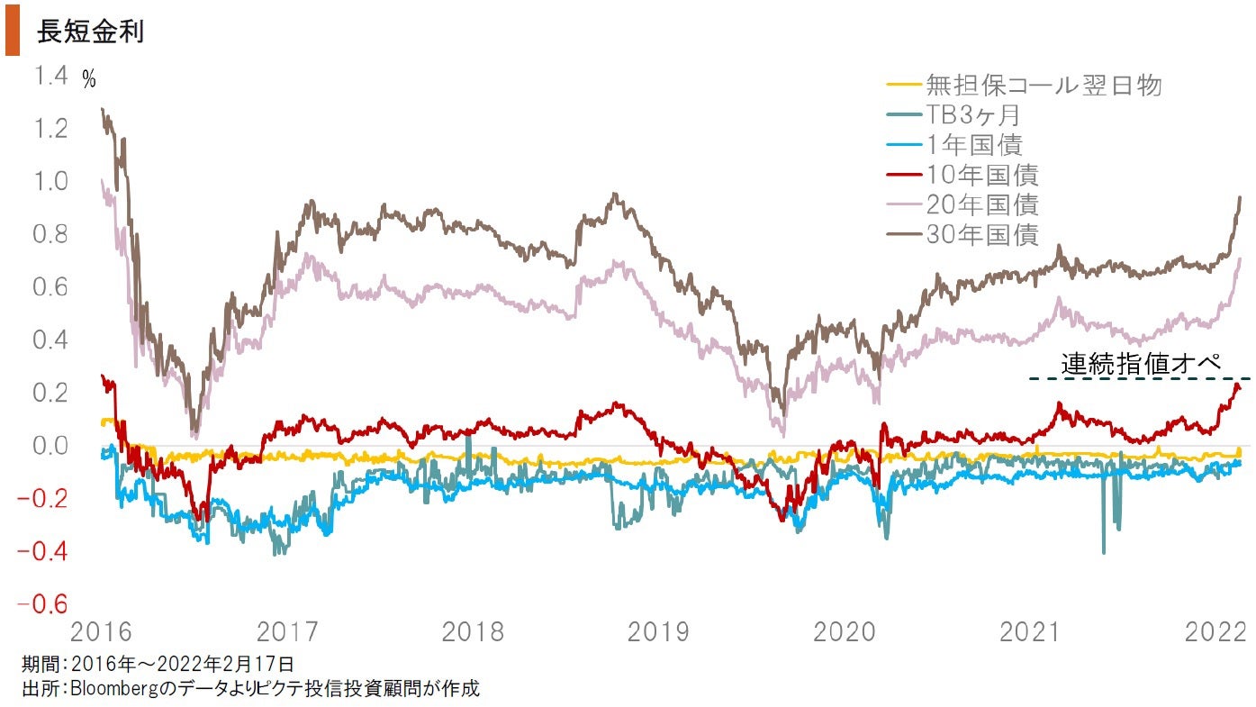 世界的なインフレ圧力の下、10年国債の利回りは日銀がターゲットレンジとする「0%±25bp」の上限に接近、日銀は2月14日から連続指値オペを開始した。中央銀行による無制限の購入の意思表示であり、当面、10年国債の売り圧力は緩和されるだろう。ただし、日銀が出口戦略としてターゲットレンジを引き上げた場合、状況が大きく変化する可能性は否定できない。