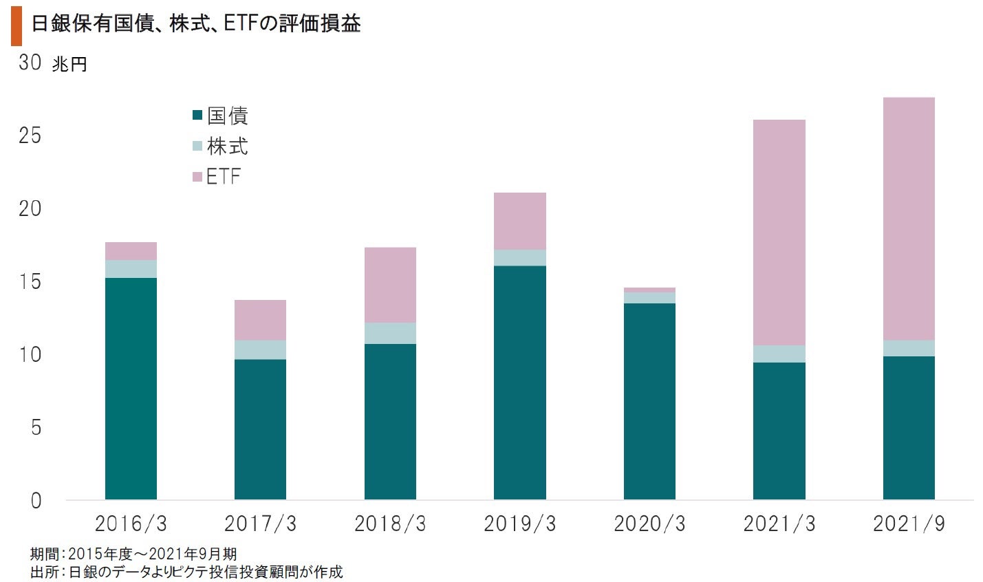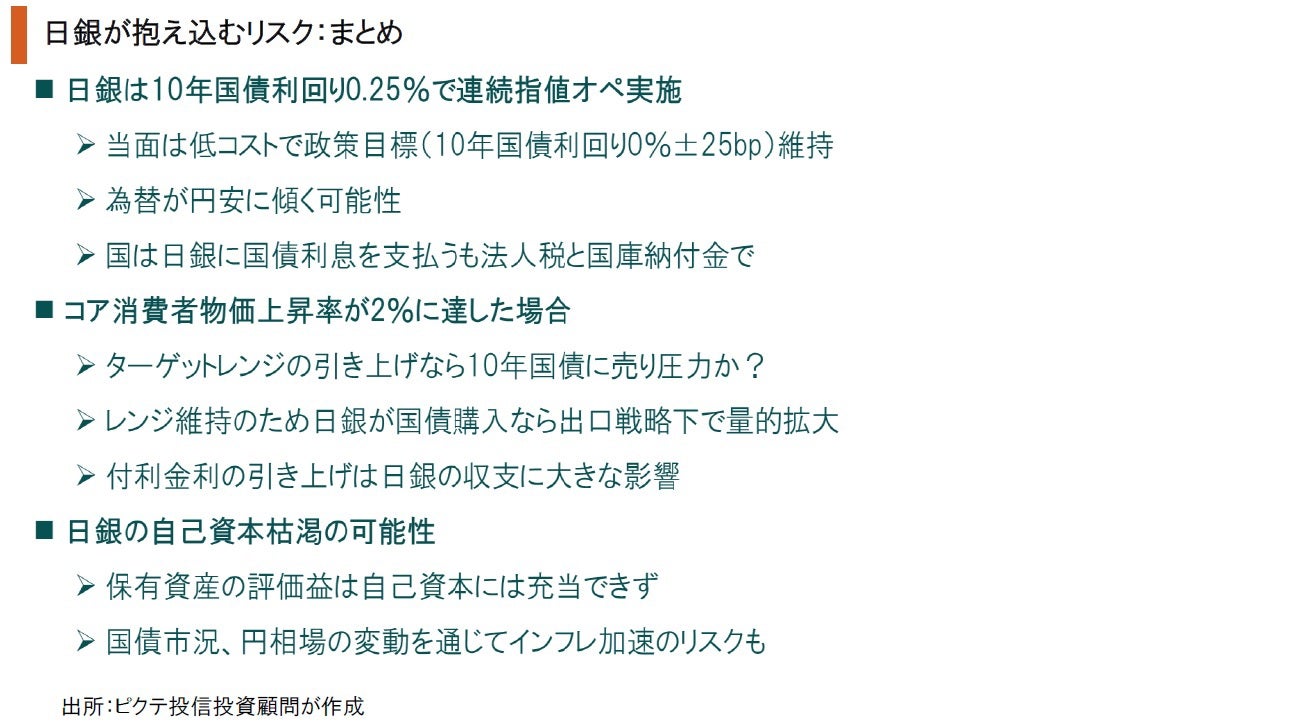 日銀のイールドカーブコントロールは、出口戦略の際、積み上がったマネタリーベースが市中に還流してインフレを加速させるリスクがある。それを抑止するため、日銀は10年国債利回りのターゲットと同時に付利金利の引き上げを迫られるのではないか。結果として利払い費が急増し、日銀の収支バランスが悪化、資金が流出するなかで過小資本状態に陥る可能性がある。一方、日銀の保有する国債、ETFなどの評価益により資本を穴埋めすることは困難だ。中央銀行の信認低下により日本国債や円の価値が揺らげば、インフレ圧力は一段と強まるだろう。これはあくまでリスクシナリオだが、金融資産の運用に当たり念頭に入れて置く必要がある。
