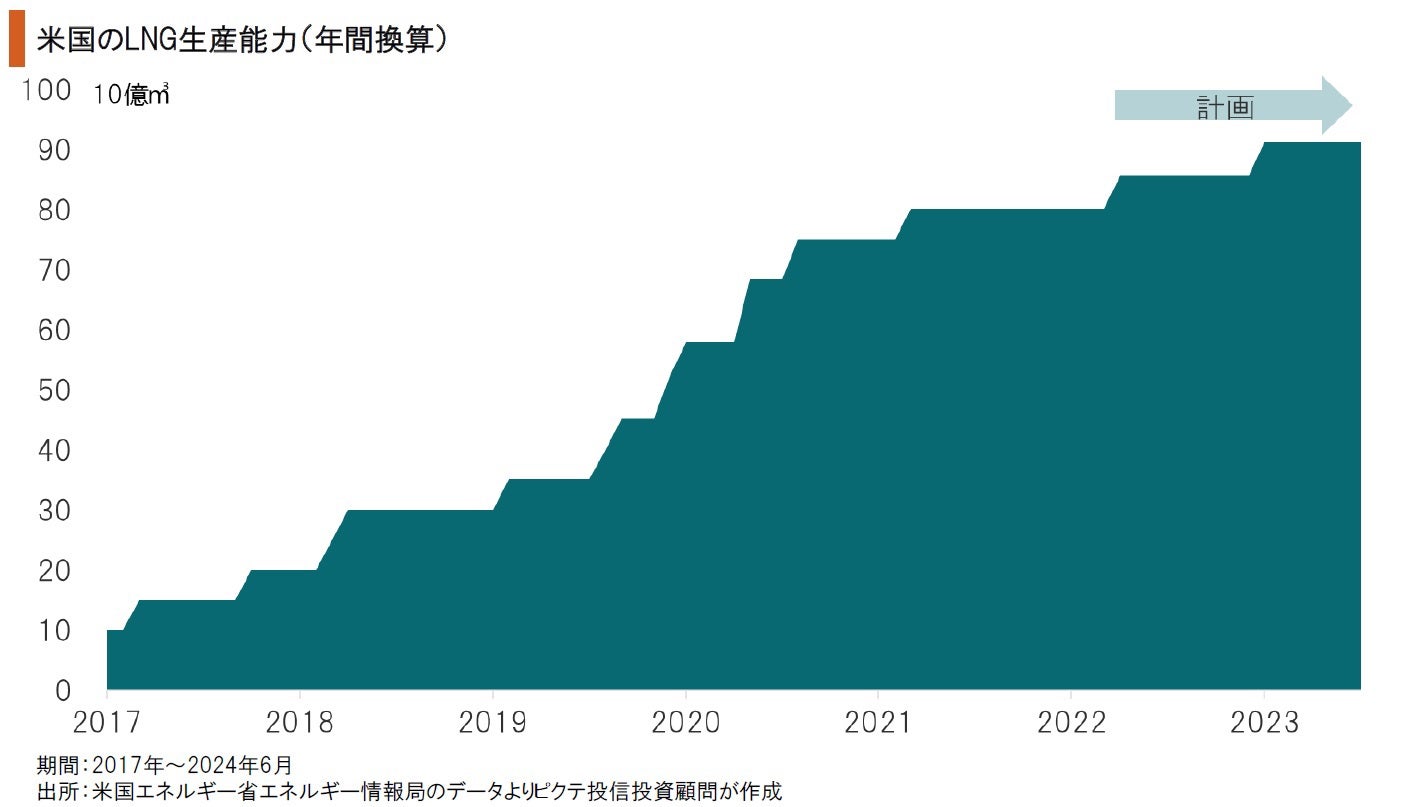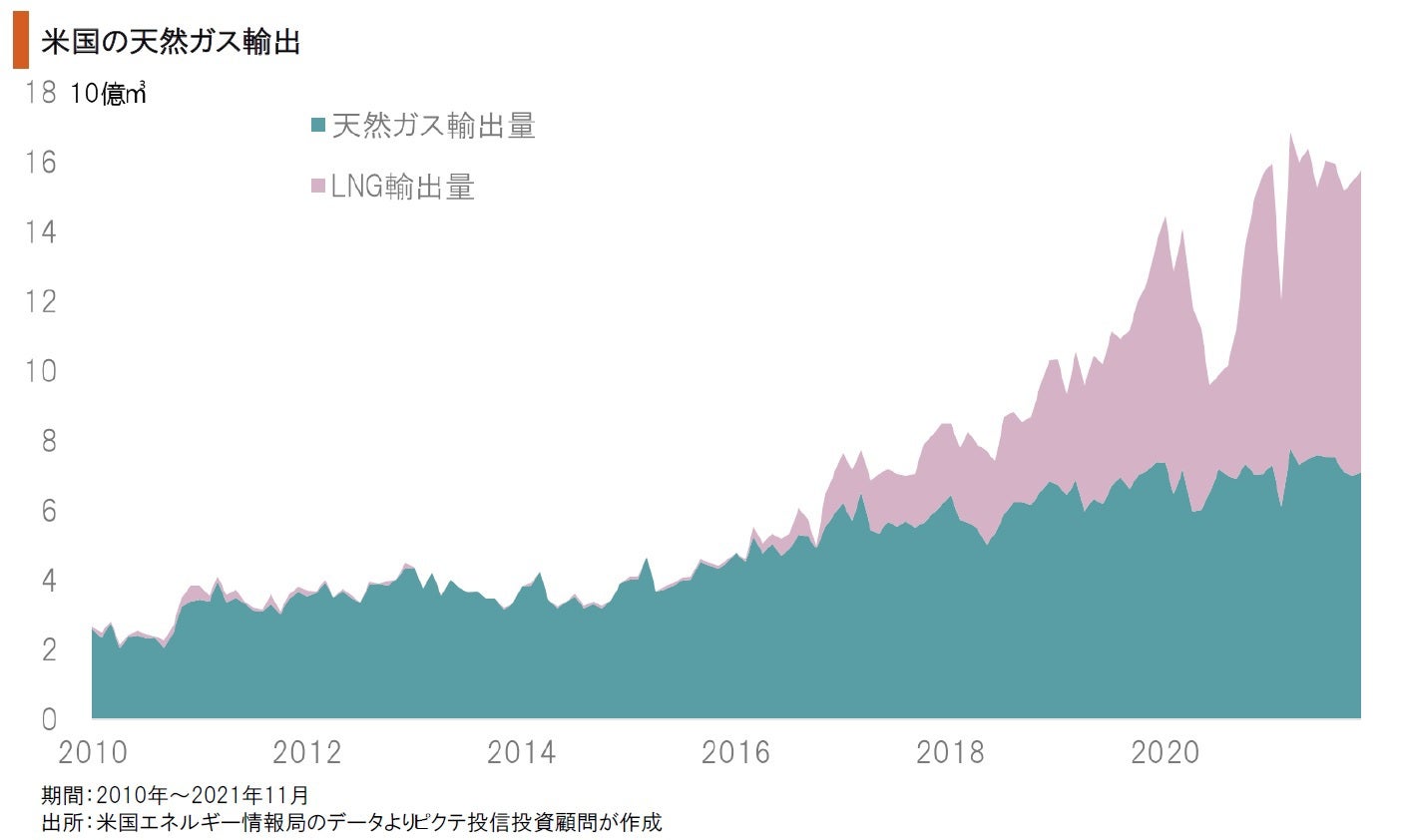 天然ガスの主成分であるメタンの沸点は常圧下で▲161.5℃だ。パイプラインならガスのまま送れるが、気体は液体に比べ同じエネルギー密度で体積が600倍であり、遠距離を運搬する場合は液化して専用タンカーで運ばなければならない。2020年における米国の総輸出量は1,375億㎥だが、このうち液化天然ガス(LNG)は全体の44.7%に相当する614億㎥だった。