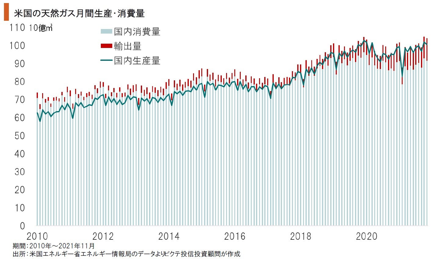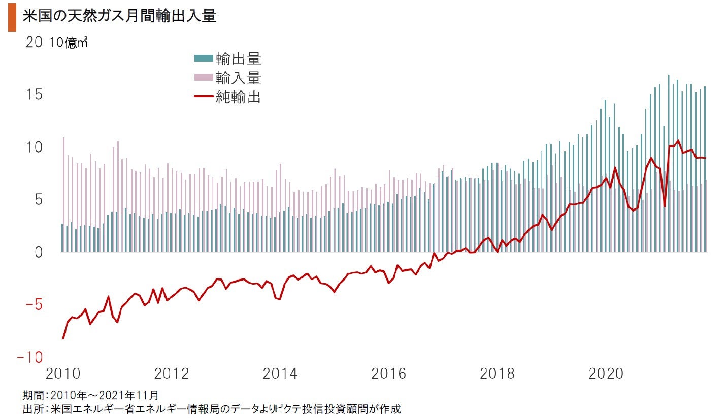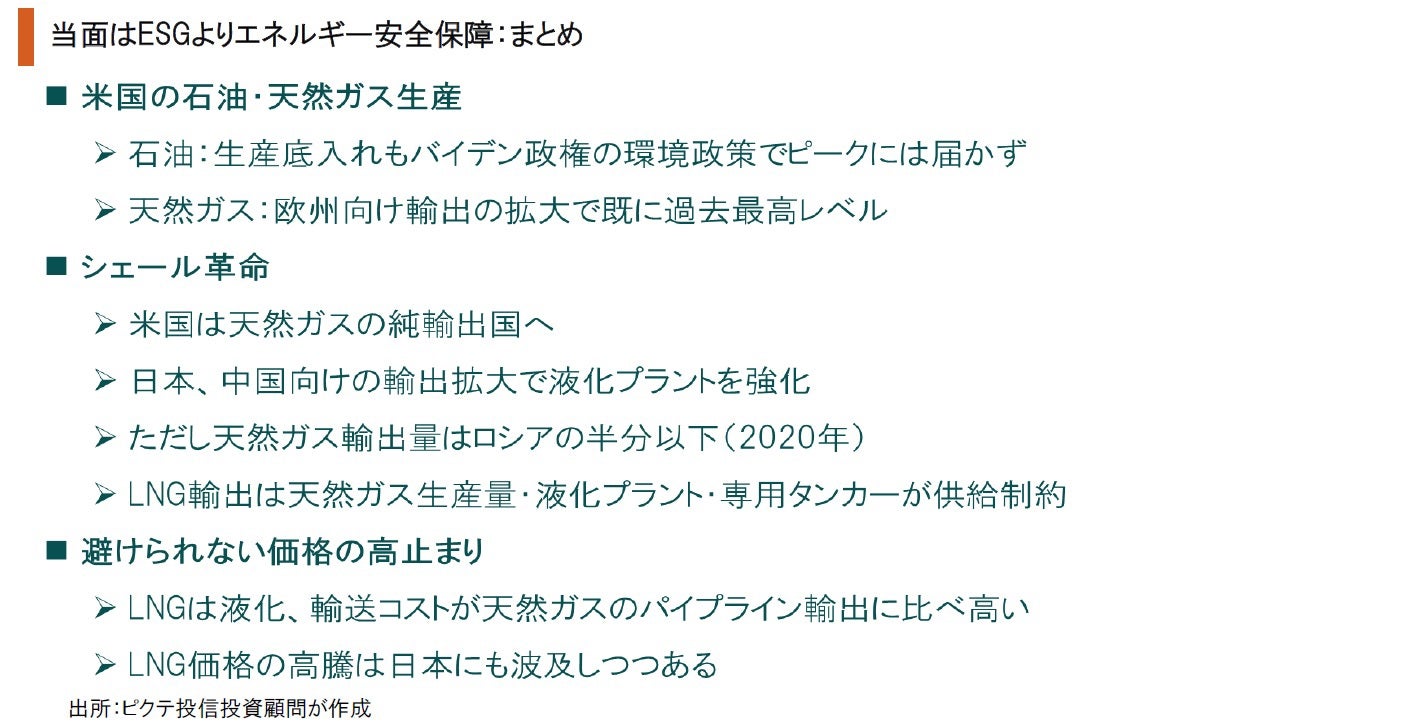 シェール革命により米国は天然ガスの純輸出国になった。もっとも、2020年の純輸出量は680億㎡に止まり、ロシアの30%に過ぎない。ウクライナ危機を受け、バイデン政権はシェールガス・シェールオイルの新規開発に関する規制を緩和、ガス、石油の増産に動くと見られるが、最大の天然ガス輸出国であるロシアの供給量を代替するのは容易ではないだろう。