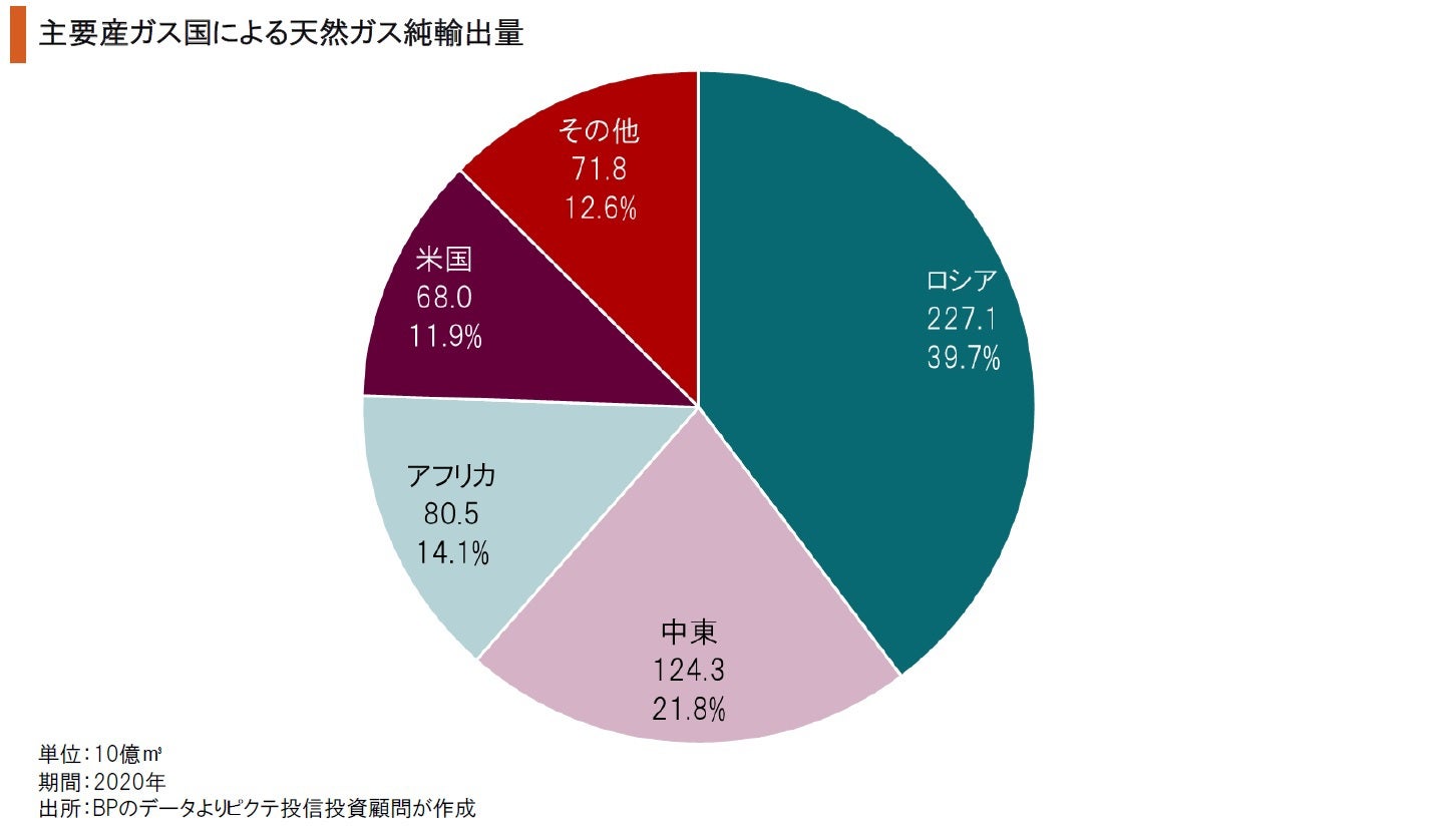 2020年における産ガス国の天然ガス純輸出量は5,717億㎥だが、その約4割をロシアが供給した。特に欧州は天然ガス消費の31.0%をロシアに依存している。2014年3月のロシアによるクリミア半島編入時、ドイツ、フランスなどが天然ガスの輸入禁止措置を採れなかったのは、自国経済への打撃が大きかったからだろう。エネルギーは欧州主要国のアキレス腱と言える。